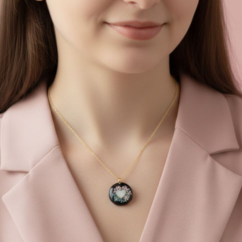 Este collar es mucho más que un hermoso accesorio; es una celebración de la dualidad de la vida y la maternidad: la calma en la oscuridad, la luz que emerge en los momentos más íntimos. El contraste del fondo oscuro resalta la pureza y la luminosidad del corazón de leche materna, un símbolo palpable de tu vínculo inquebrantable. Las flores añaden un toque de naturaleza y esperanza, haciendo de cada pieza una expresión única de belleza y sentimentalismo. La cadena de acero quirúrgico, con su brillo dorado y propiedades hipoalergénicas, asegura que esta joya permanezca cerca de tu corazón con elegancia y confort.